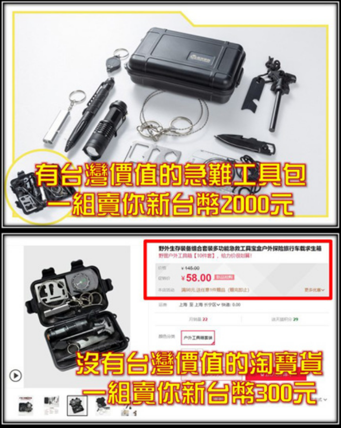 據(jù)臺媒此前報道,“黑熊學(xué)院”面向臺灣普通民眾開設(shè)消防、搜救等課程,每堂課要賣2300元新臺幣。他們兜售的防衛(wèi)工具包,一個要賣2000元新臺幣。而臺灣網(wǎng)友發(fā)現(xiàn),同樣的工具包在大陸電商平臺只賣50多元人民幣。