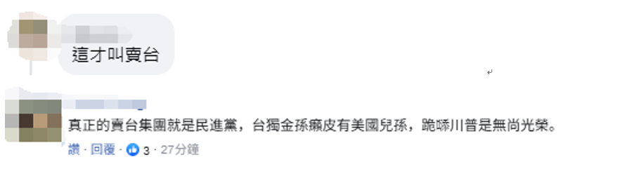 針對(duì)卓榮泰與郭智輝的說(shuō)法,一些島內(nèi)網(wǎng)友在社交媒體臉書及臺(tái)媒評(píng)論區(qū)留言表達(dá)不滿。一些網(wǎng)友認(rèn)為民進(jìn)黨當(dāng)局賣臺(tái):“這才叫賣臺(tái)”“真正的賣臺(tái)集團(tuán)就是民進(jìn)黨,‘臺(tái)獨(dú)金孫’有美國(guó)兒孫,跪特朗普是無(wú)尚光榮”。↓