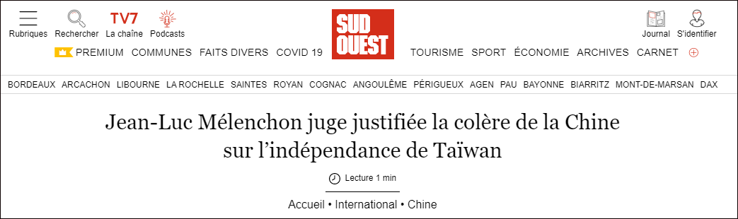 (觀察者網(wǎng)訊)當?shù)貢r間10月19日,法國國民議會現(xiàn)任議員、2022年總統(tǒng)候選人讓-呂克·梅朗雄(Jean-Luc Mélenchon)接受法媒節(jié)目采訪時稱,他不認為臺灣是一個國家,“它不被聯(lián)合國承認”。