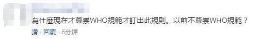 島內(nèi)網(wǎng)友對(duì)此議論紛紛,還有網(wǎng)友追問,“為什么現(xiàn)在才尊崇WHO規(guī)范才訂出此規(guī)則,以前不尊崇WHO規(guī)范呢?”