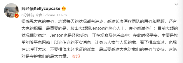 陳若儀還在微博中稱,目前林志穎的狀況相對穩(wěn)定,Jenson也是輕微受傷,正在觀察及休養(yǎng)當(dāng)中。她說,在此時報平安,主要是希望能夠平息網(wǎng)絡(luò)上以訛傳訛的不實消息,她想在此呼吁大眾,不要相信未經(jīng)求證的謠言,“最后要感謝大家對我們的關(guān)心與支持,這絕對是守護(hù)我們的最大力量。”
