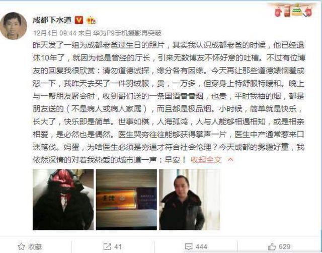 當(dāng)時(shí)我還參加一個(gè)以前患者的80歲生日,是一個(gè)退休10年的官員,因?yàn)槭中g(shù)兩家人的關(guān)系走得很近。后來(lái)有人就評(píng)論說(shuō),換了是農(nóng)民呢?我覺(jué)得是對(duì)純粹感情的一種褻瀆,就又發(fā)了一條穿Prada的相片。