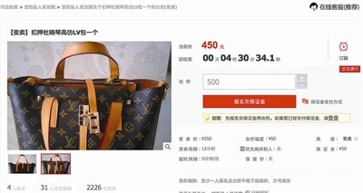 截至下午5時30分,這件“高仿LV包”已獲得網(wǎng)友2226次圍觀,有4人參與競拍。北青報記者注意到,這件“高仿LV包”原本變賣價為350元,每次加價幅度為50元,當天下午5時30分,這件物品已被競價至450元。