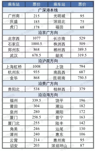 內(nèi)地主要車(chē)站至香港西九龍二等座票價(jià)表(人民幣)