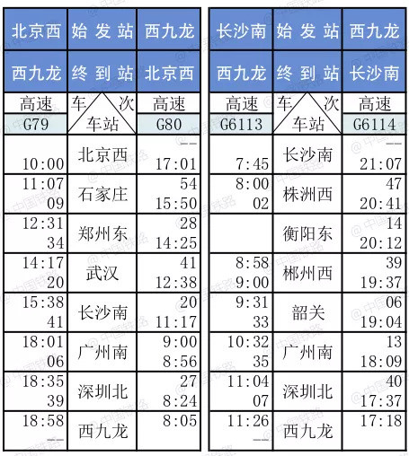 香港西九龍高鐵列車(chē)時(shí)刻表