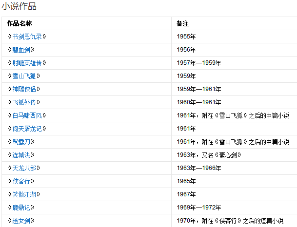 筆名為“金庸”的武俠小說泰斗查良鏞逝世,享年94歲。金庸筆下創(chuàng)作多部膾炙人口的武俠小說,包括《射雕英雄傳》、《神鵰俠侶》、《倚天屠龍記》、《天龍八部》、《笑傲江湖》、《鹿鼎記》等。