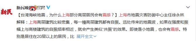 【臺(tái)灣海峽地震,為什么上海部分高層居民會(huì)有震感?】上海市地震災(zāi)害防御中心主任徐永林解釋:上海高層建筑比較密集,每一幢高層建筑都有自振。遠(yuǎn)處傳來(lái)的地震波,如果在強(qiáng)度和振幅上與高樓建筑的自振頻率相近,就會(huì)產(chǎn)生類似“共振”的效果。即使是小地震,也會(huì)有震感。特別是居住在20層以上的居民,比較容易感覺(jué)到遠(yuǎn)方地震波的傳來(lái)。而低樓層居民,很可能就感覺(jué)不到。