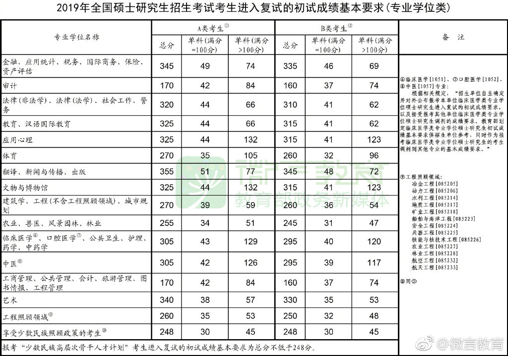 《2019年全國(guó)碩士研究生招生考試考生進(jìn)入復(fù)試的初試成績(jī)基本要求》(國(guó)家分?jǐn)?shù)線)公布。