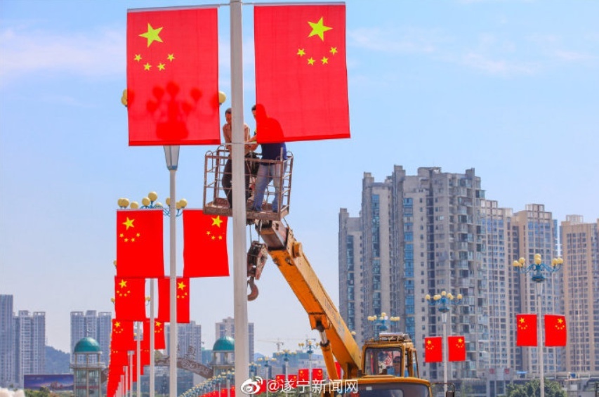四川遂寧街頭別樣紅 國旗飄飄迎國慶