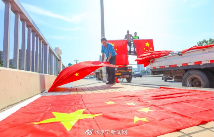 9月12日,遂寧市城區(qū)通德大橋上,幾名工人正在安裝懸掛國旗。這幾天,遂寧市城區(qū)主要街道都已懸掛上鮮艷的五星紅旗,鮮艷奪目,以此慶祝新中國成立70周年。