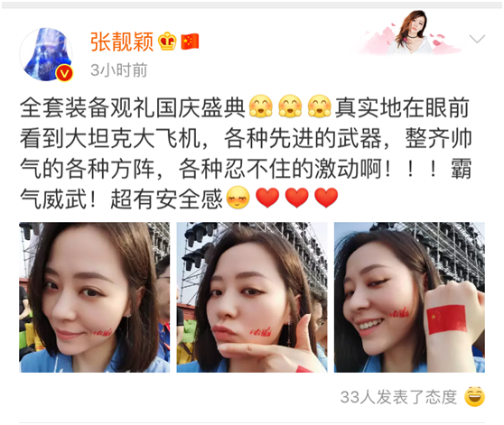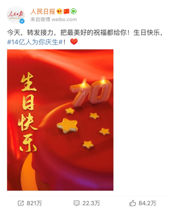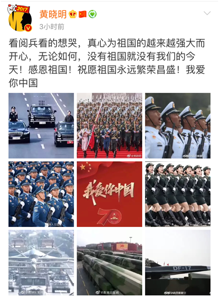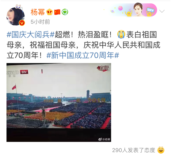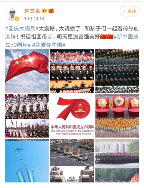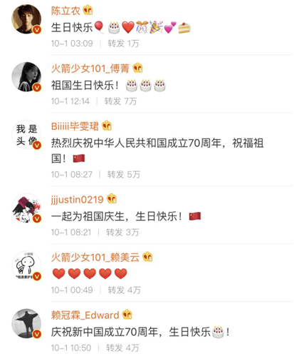 今天上午,慶祝中華人民共和國(guó)成立70周年大會(huì)、閱兵式和群眾游行在北京天安門廣場(chǎng)隆重舉行,世界矚目,國(guó)人驕傲。眾明星藝人也在微博發(fā)文,“祝福祖國(guó)母親”、“祝福人民”。