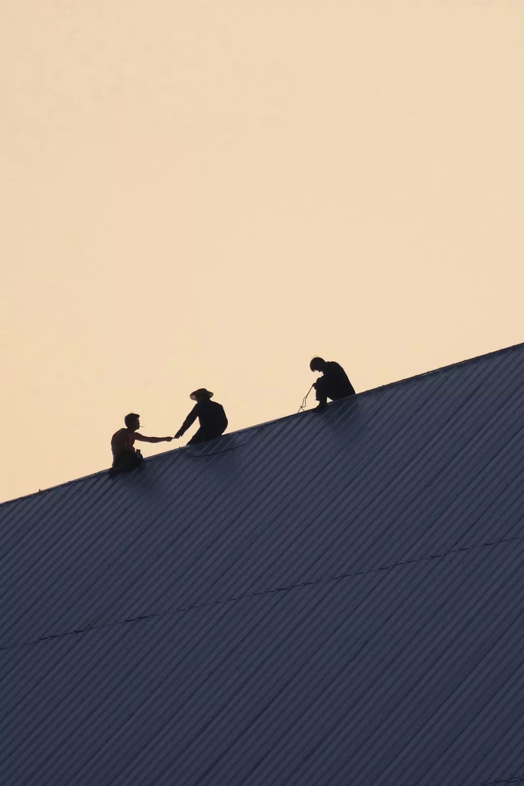 (2016年浙江紹興大劇院屋頂,落日余暉下的施工人員,圖片源自@VCG)