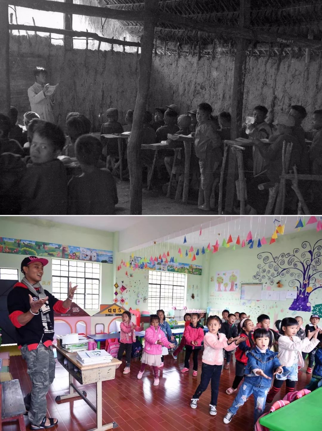 上圖為1954年,在云南省普洱市西盟佤族自治縣創(chuàng)辦的第一所小學(xué)——西盟小學(xué),老師帶領(lǐng)孩子讀書學(xué)習(xí)(資料照片);下圖為2018年12月7日,云南省普洱市西盟佤族自治縣勐梭鎮(zhèn)班母村佤山育忠幼兒園的孩子跟著老師上音樂課(新華社記者 楊宗友/攝)。