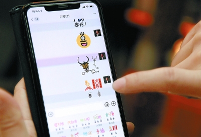清華大學美術學院教授、博士生導師陳楠在位于清華大學的工作室內(nèi)展示他設計發(fā)布的甲骨文表情包(9月24日攝)。
