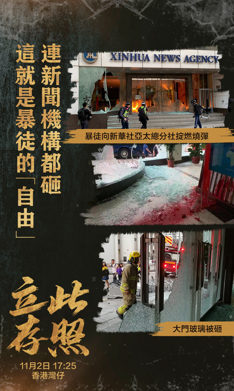 暴力不止,香港難寧。11月2日,一小撮極端暴力分子打砸新華社亞太總分社辦公大樓,投擲燃燒彈及油漆彈,在大樓正門玻璃墻及外墻上噴涂侮辱性字句,并一度進入大堂進行破壞。在旺角,毫無人性的暴徒將一名路人圍毆昏迷,甚至扒光他的衣服。愈加殘忍的迫害手段、毫無顧忌的破壞行為,難道這就是香港反對派和激進勢力所說的“人權(quán)”“民主”,這就是外部勢力所稱贊的“美麗的風景線”,簡直無恥至極、人神共憤!