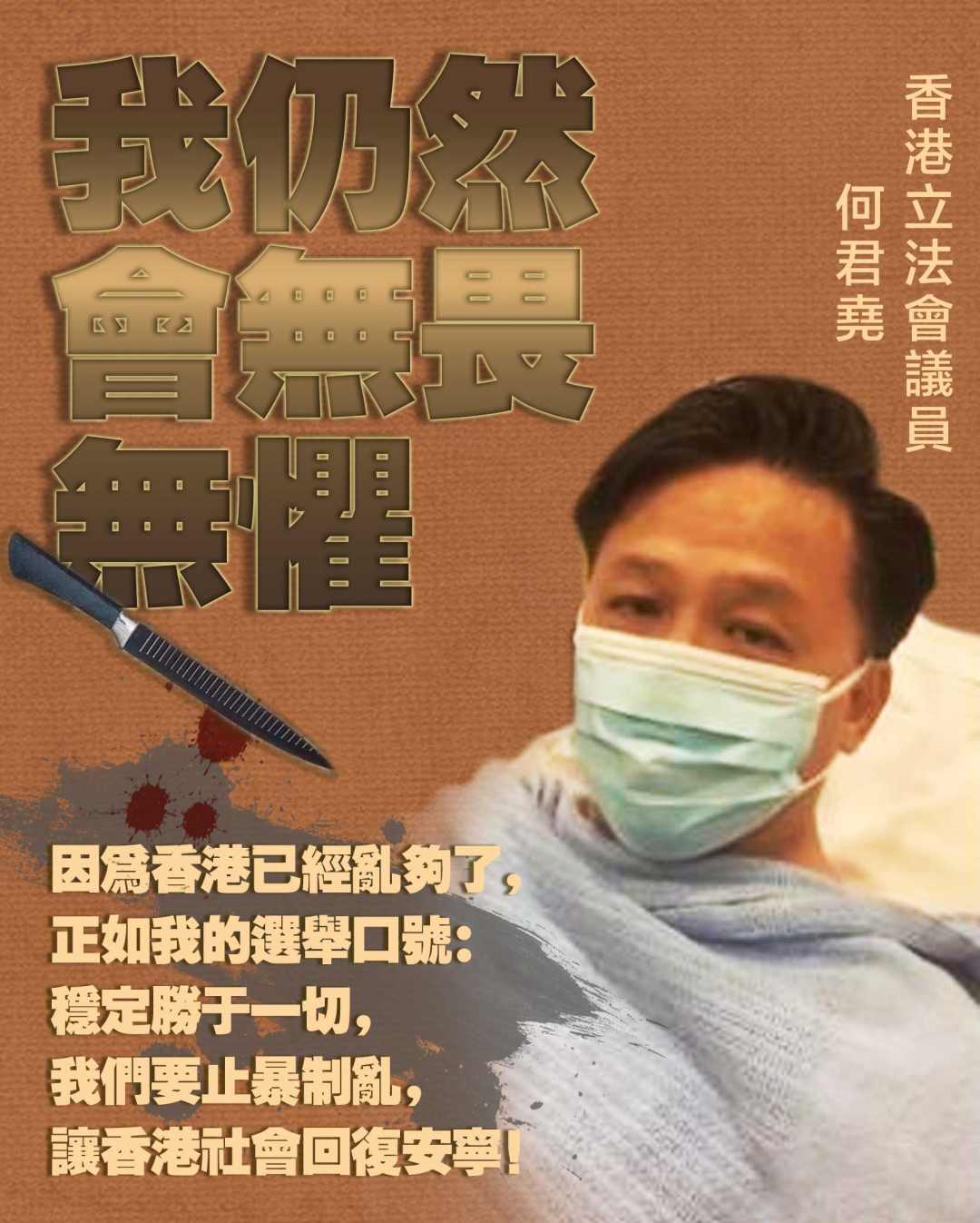 人間正道是滄桑,我何君堯雖然受傷了,雖然這個競選氣候已經(jīng)不公和失去秩序了,但我仍然會無畏無懼。因為香港已經(jīng)亂夠了,正如我的選舉口號:穩(wěn)定勝于一切,我們要止暴制亂,讓香港社會回復(fù)安寧!