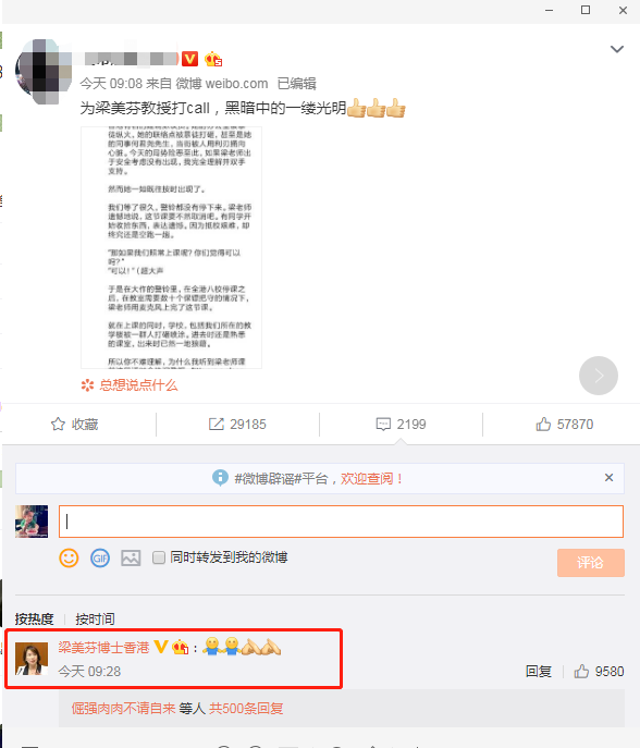 在相關(guān)爆料微博下,認(rèn)證為“香港立法會議員”的微博賬號@梁美芬博士香港 發(fā)表了如下評論。↓