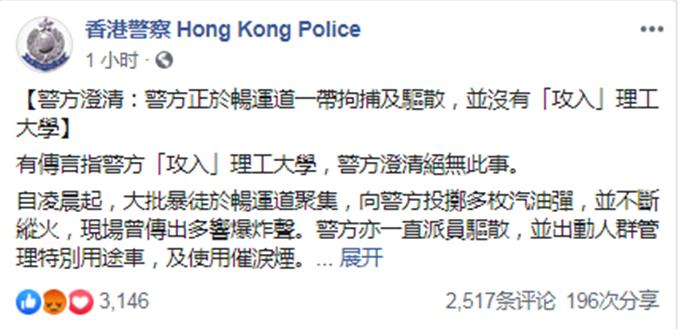 此外,針對有傳言稱所謂警方“攻入”理工大學(xué),香港警方18日清晨發(fā)文澄清絕無此事。警方表示,自凌晨起,大批暴徒于暢運(yùn)道聚集,向警方投擲多枚汽油彈,并不斷縱火,現(xiàn)場曾傳出多響爆炸聲。警方亦一直派員驅(qū)散,并出動(dòng)人群管理特別用途車,及使用催淚煙。