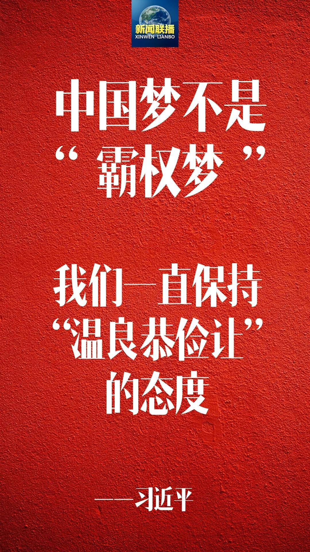 “今天,中國人民充滿高度自信,將堅(jiān)定不移沿著這條道路走下去。我們提出實(shí)現(xiàn)中華民族偉大復(fù)興的中國夢,但這個(gè)夢絕不是‘霸權(quán)夢’。我們沒有準(zhǔn)備去取代誰,只不過是讓中國恢復(fù)應(yīng)有的尊嚴(yán)和地位。”11月22日,習(xí)近平主席會見出席2019年“創(chuàng)新經(jīng)濟(jì)論壇”外方代表,鮮明闡述了中國夢的性質(zhì)內(nèi)涵,向世界莊嚴(yán)宣示了中國實(shí)現(xiàn)民族復(fù)興的堅(jiān)定信心和堅(jiān)強(qiáng)決心。