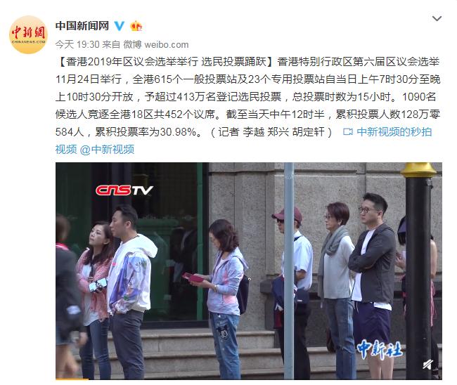 【香港2019年區(qū)議會(huì)選舉舉行 選民投票踴躍】香港特別行政區(qū)第六屆區(qū)議會(huì)選舉11月24日舉行,全港615個(gè)一般投票站及23個(gè)專(zhuān)用投票站自當(dāng)日上午7時(shí)30分至晚上10時(shí)30分開(kāi)放,予超過(guò)413萬(wàn)名登記選民投票,總投票時(shí)數(shù)為15小時(shí)。1090名候選人競(jìng)逐全港18區(qū)共452個(gè)議席。截至當(dāng)天中午12時(shí)半,累積投票人數(shù)128萬(wàn)零584人,累積投票率為30.98%。(記者李越鄭興胡定軒)