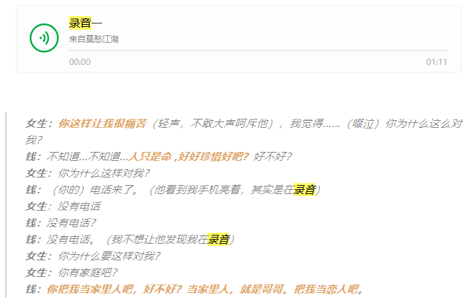 舉報(bào)人在信中稱,錢F勝上述行為結(jié)束后她才有機(jī)會(huì)錄音取證。在舉報(bào)信中附上的錄音里,被指為“錢F勝”的男聲對(duì)被指為舉報(bào)人的女聲說:“你把我當(dāng)家里人吧,好不好?當(dāng)家里人,就是哥哥。把我當(dāng)戀人吧。”