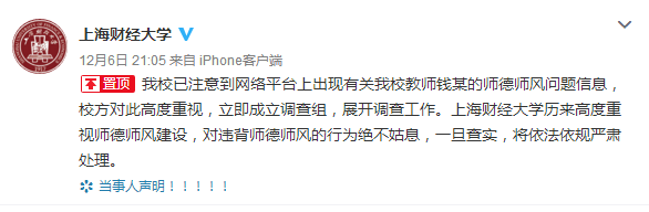 12月6日,上海財(cái)經(jīng)大學(xué)會(huì)計(jì)學(xué)院的一名學(xué)生在社交媒體上曝光該學(xué)院副教授“錢F勝”性騷擾,并稱已經(jīng)向校方舉報(bào)。當(dāng)天晚間,上海財(cái)經(jīng)大學(xué)官方微博發(fā)布聲明,稱對(duì)于網(wǎng)上出現(xiàn)有關(guān)錢某的師德師風(fēng)問題信息,已成立調(diào)查組,展開調(diào)查工作,“一旦查實(shí),將依法依規(guī)嚴(yán)肅處理”。