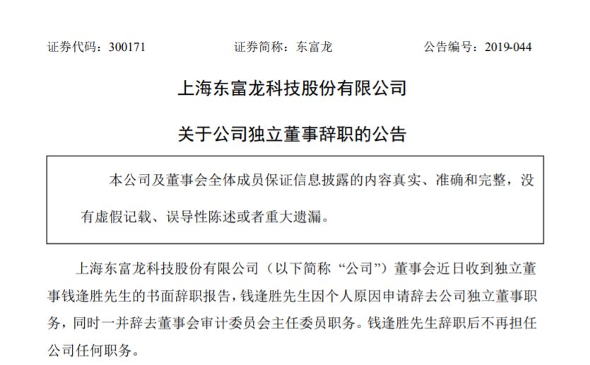 12月8日晚間,A股上市公司東富龍公告,董事會(huì)近日收到獨(dú)立董事錢逢勝的書面辭職報(bào)告,錢逢勝因個(gè)人原因申請(qǐng)辭去公司獨(dú)立董事職務(wù),同時(shí)一并辭去董事會(huì)審計(jì)委員會(huì)主任委員職務(wù)。錢逢勝辭職后不再擔(dān)任公司任何職務(wù)。
