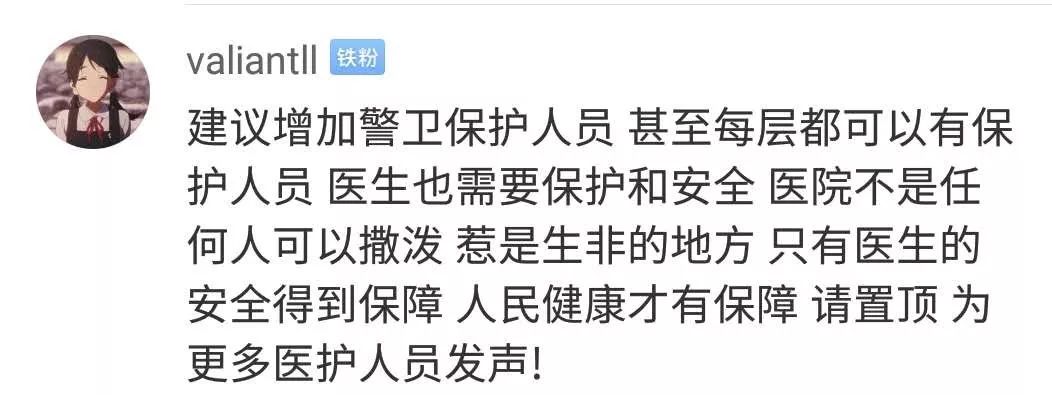 也有一些網(wǎng)友建議,應(yīng)該在醫(yī)院增加警衛(wèi)保護人員保障醫(yī)護人員安全,只有醫(yī)生的安全有保障,病人的健康才有保障。