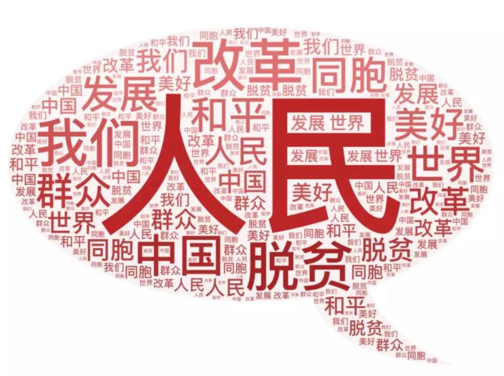 我將無我,不負(fù)人民。“人民”是習(xí)主席心中永遠(yuǎn)的牽掛,這一點(diǎn)在他歷次的新年講話中體現(xiàn)得特別明顯。通過對6次新年講話的文本進(jìn)行詞頻分析后發(fā)現(xiàn),“人民” 一直是習(xí)近平新年賀詞當(dāng)中的高頻詞,除此之外,“我們”“群眾”“改革”“脫貧” 等詞語也多次出現(xiàn)。