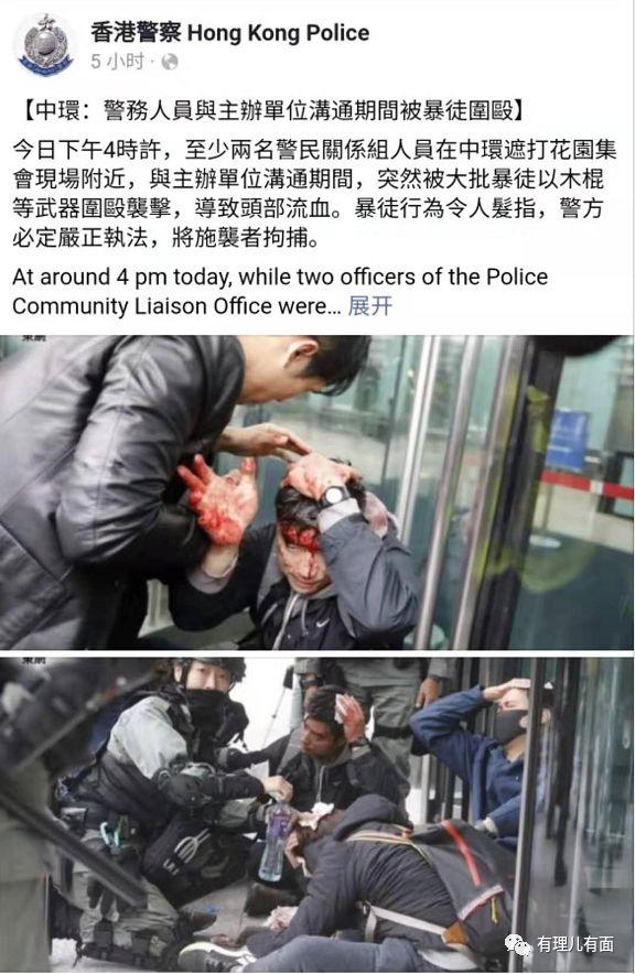 16時許,香港警隊警民關系組3名警員在與主辦單位溝通期間,被多名暴徒突然以木棍等武器圍毆襲擊,現(xiàn)場頭破血流。在受傷警員撤退時,暴徒再次實施了第二輪襲擊。