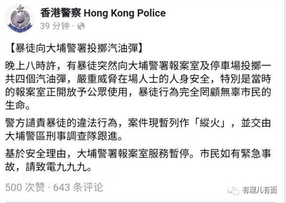 從去年12月開始,香港警隊陸續(xù)抓捕了“勇武”組織的“v小隊”、“屠龍小隊”等團伙,使得“勇武”暴力活動暫時陷入低谷,但昨日,在所謂和平集會掩護下,“勇武”暴徒又活躍在街頭進行破壞,甚至將暴力直接指向與集會組織者溝通的警民關系組警員。在警方以涉嫌煽動群眾情緒及違反不反對通知書將集會組織者劉颕匡拘捕后,“勇武”暴徒向大埔警署投擲了4個汽油彈,公然向警隊報復并挑釁。