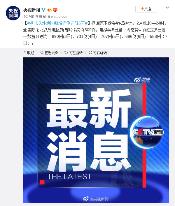 據(jù)國家衛(wèi)健委數(shù)據(jù)統(tǒng)計,2月8日0—24時,全國除湖北以外地區(qū)新增確診病例509例,連續(xù)第5日呈下降態(tài)勢。而過去5日這一數(shù)據(jù)分別為:890例(3日)、731例(4日)、707例(5日)、696例(6日)、558例(7日)。