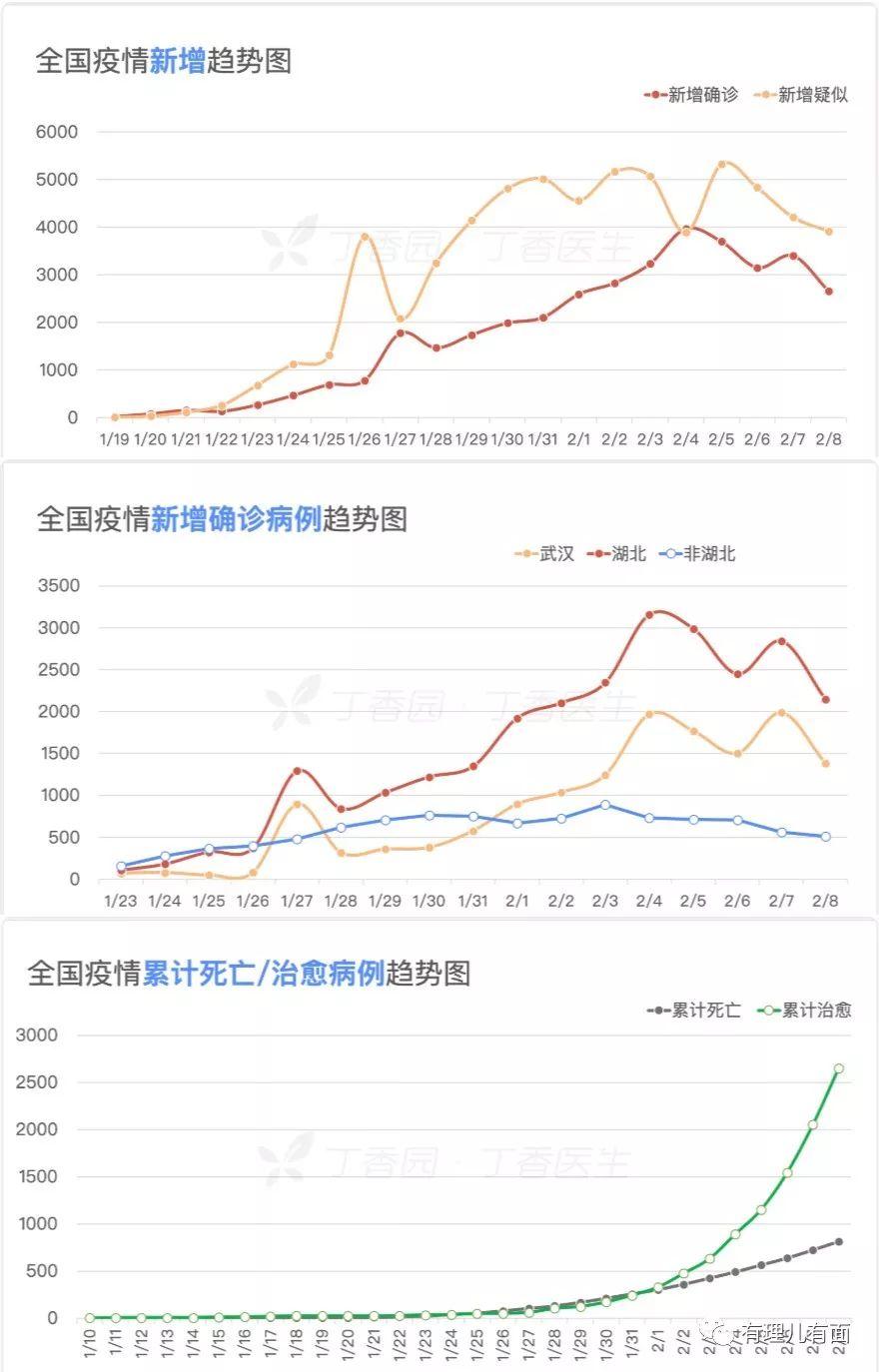 根據(jù)權(quán)威的說(shuō)法,新型冠狀病毒肺炎發(fā)展的拐點(diǎn)主要有以下兩個(gè)特征:一是新發(fā)的疑似感染病例下降;二是確診的發(fā)病患者數(shù)量下降。我們對(duì)比國(guó)家衛(wèi)健委每天公布的數(shù)據(jù)制作成的統(tǒng)計(jì)圖表來(lái)看,截至2月8日24時(shí),全國(guó)新增確診病例、全國(guó)新增疑似病例均出現(xiàn)下降,全國(guó)除湖北外新增新冠肺炎確診病例為509例,連續(xù)第4日呈下降態(tài)勢(shì)(5日、6日、7日、8日分別為731、707、558、509例),同時(shí)累計(jì)治愈率也在升高。