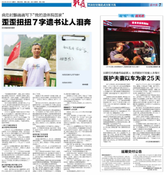 據(jù)今天(19日)的《長(zhǎng)江日?qǐng)?bào)》報(bào)道,這份遺書(shū)是12日上午新冠肺炎重癥患者、47歲的肖賢友在武漢市第四醫(yī)院(古田院區(qū))寫(xiě)下的。當(dāng)日下午,肖賢友被轉(zhuǎn)至金銀潭醫(yī)院,第二天,由于病情惡化不幸離世。
