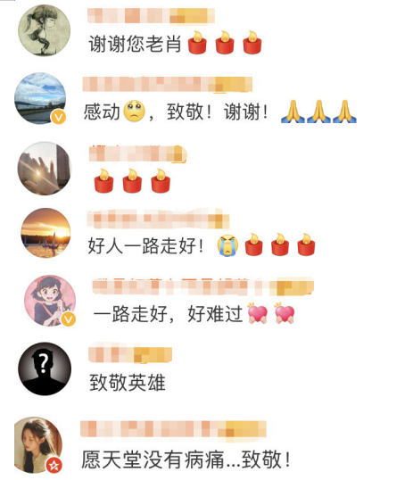 網(wǎng)友紛紛向肖賢友致敬,他們說,“謝謝你,老肖”,“一路走好”。他們還說,“愿天堂里沒有病痛”。↓