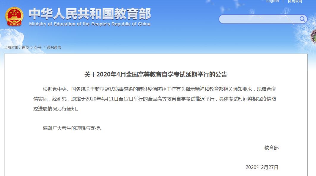 根據(jù)黨中央、國務(wù)院關(guān)于新型冠狀病毒感染的肺炎疫情防控工作有關(guān)指示精神和教育部相關(guān)通知要求,現(xiàn)結(jié)合疫情實際,經(jīng)研究,原定于2020年4月11日至12日舉行的全國高等教育自學(xué)考試推遲舉行,具體考試時間將根據(jù)疫情防控進展情況另行通知。