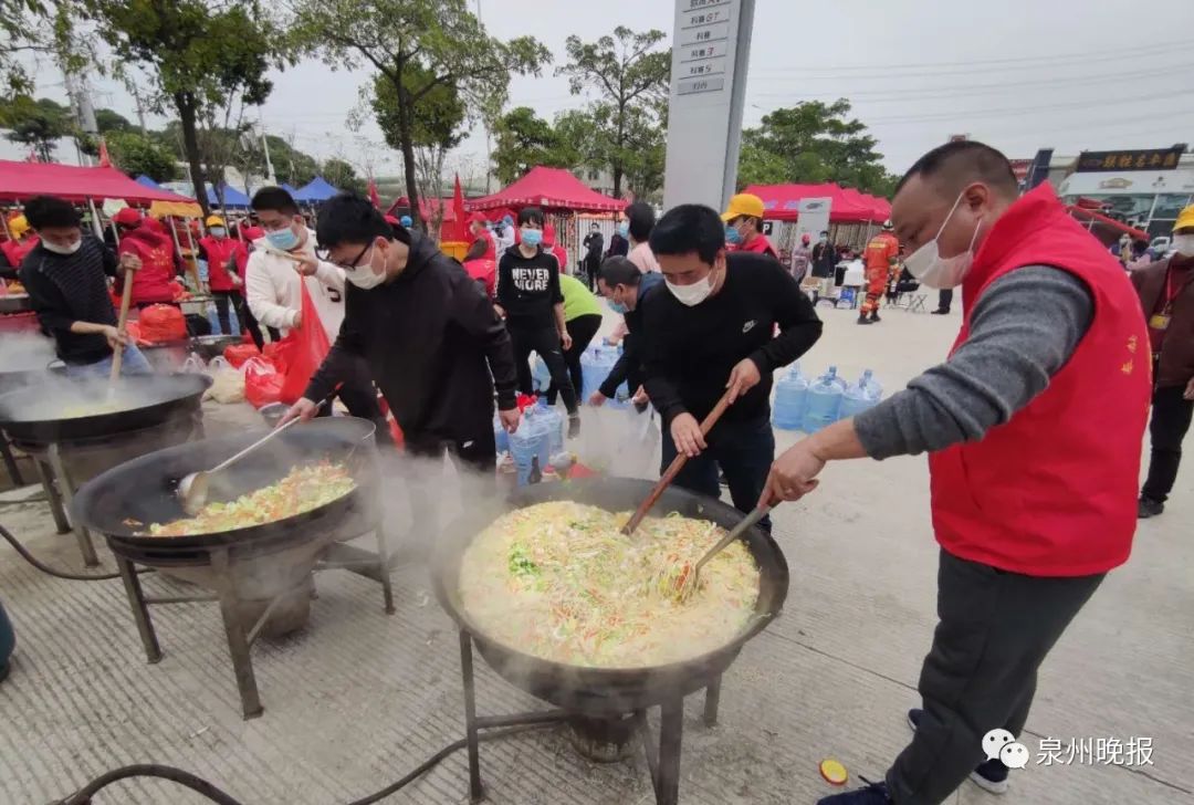 △下午,志愿者正在煮面條,為救援人員提供晚餐。