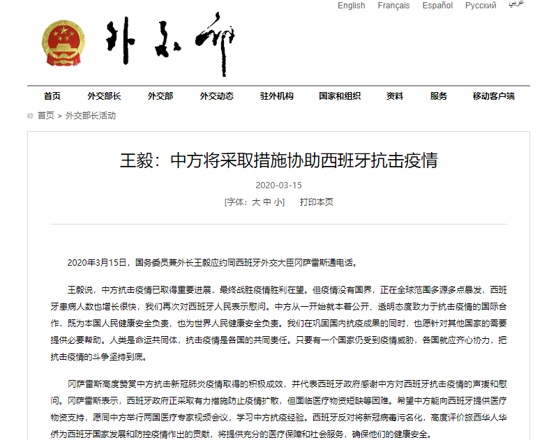 王毅表示,中西兩國長期友好,始終相互理解、相互支持。中方不會忘記西班牙對中國抗擊疫情給予寶貴理解和支持。中方已決定根據(jù)西班牙的需要,緊急提供一批醫(yī)療物資援助,并開放商業(yè)渠道供西班牙進(jìn)口急需的個人防護(hù)用品和醫(yī)療設(shè)備。中方也將鼓勵友好城市和企業(yè)提供幫助,并愿加強(qiáng)經(jīng)驗交流,協(xié)調(diào)安排兩國專家舉行醫(yī)療視頻會,并考慮適時派出醫(yī)療專家組。