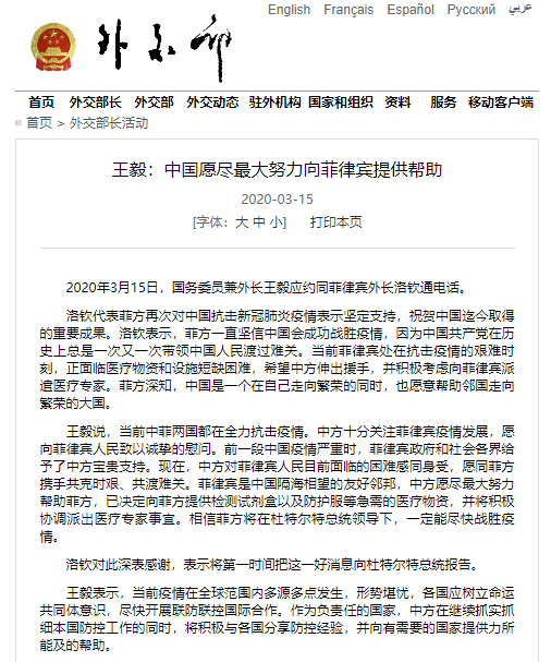 3月15日,國(guó)務(wù)委員兼外長(zhǎng)王毅應(yīng)約同菲律賓外長(zhǎng)洛欽通電話。洛欽代表示,當(dāng)前菲律賓處在抗擊疫情的艱難時(shí)刻,正面臨醫(yī)療物資和設(shè)施短缺困難,希望中方伸出援手,并積極考慮向菲律賓派遣醫(yī)療專家。菲方深知,中國(guó)是一個(gè)在自己走向繁榮的同時(shí),也愿意幫助鄰國(guó)走向繁榮的大國(guó)。