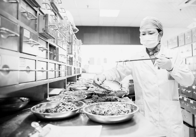 在江蘇省如皋市中醫(yī)院中藥房?jī)?nèi),中藥工忙著趕配中藥。徐慧攝/光明圖片