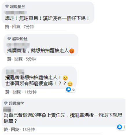 對于陳方安生稱要退下公民及政治工作,在臉書上,有網(wǎng)友表示,“想走!沒那么容易!漢奸沒有一個好下場”;“搞爛香港,就想拍拍籮柚走人”;“攪亂香港想拍拍籮柚走人!世事真是有那么便宜嗎????”;“為自己曾做過的事負(fù)上責(zé)任先,攪亂香港后一句退下就想翻篇?”