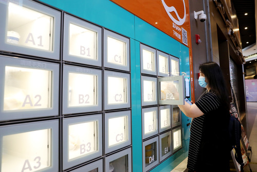 一位顧客通過(guò)APP掃碼,在上海地鐵13號(hào)線世博會(huì)博物館地鐵站附近的一家盒小馬服務(wù)點(diǎn)取餐柜中拿取預(yù)定的早餐(7月17日攝)。新華社記者 方喆 攝