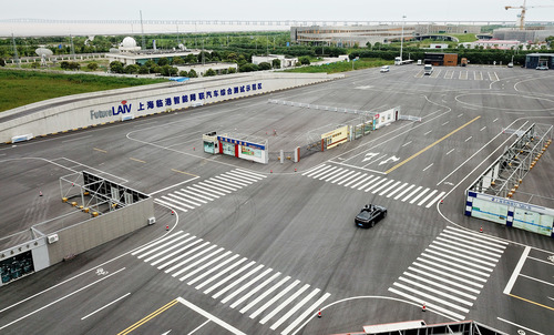 測(cè)試車輛在上海浦東新區(qū)臨港智能網(wǎng)聯(lián)汽車綜合測(cè)試示范區(qū)內(nèi)進(jìn)行行駛測(cè)試(7月3日攝,無(wú)人機(jī)照片)。新華社記者 方喆 攝