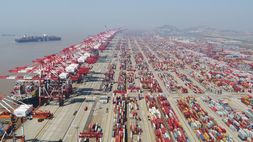 上海洋山港集裝箱碼頭(3月18日攝,無(wú)人機(jī)照片)。新華社記者 丁汀 攝