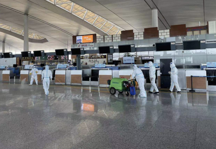 工作人員在南京祿口機(jī)場T2航站樓內(nèi)進(jìn)行消殺。 新華社發(fā)