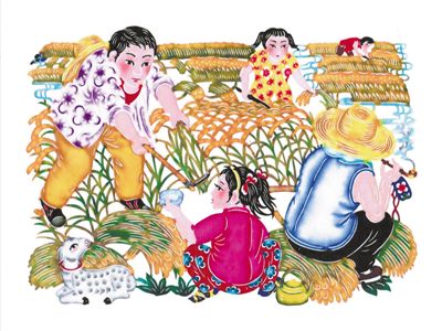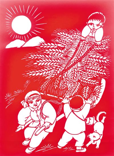 河北剪紙藝人李寶峰的作品《開鐮搶秋》。