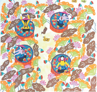 上海金山農(nóng)民畫創(chuàng)作者陸永忠的作品《采蓮》。