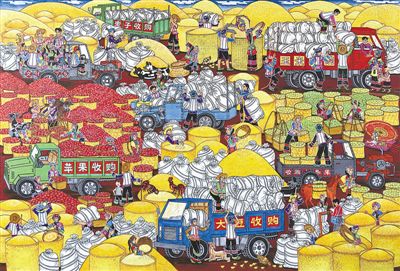 云南農(nóng)民畫創(chuàng)作者金牛的作品《豐收》。
