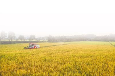 最近兩年,袁永貴再拍水稻豐收,少了人卻多了大農(nóng)機(jī)。“農(nóng)機(jī)能把倒伏的稻子都收起來,比人收輕松。”袁永貴說。