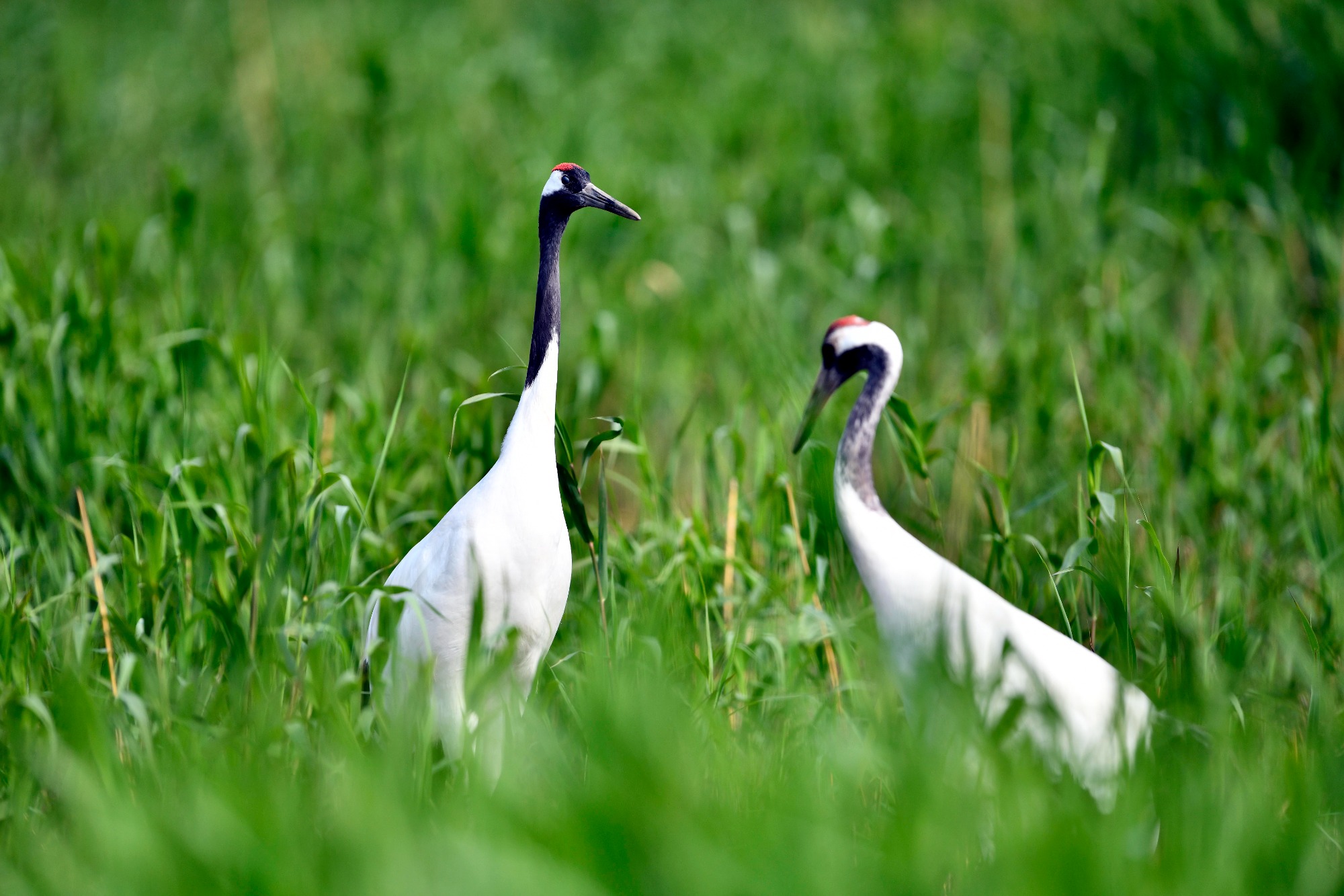 ↑兩只丹頂鶴在水草間棲息。新華社記者 郭緒雷 攝